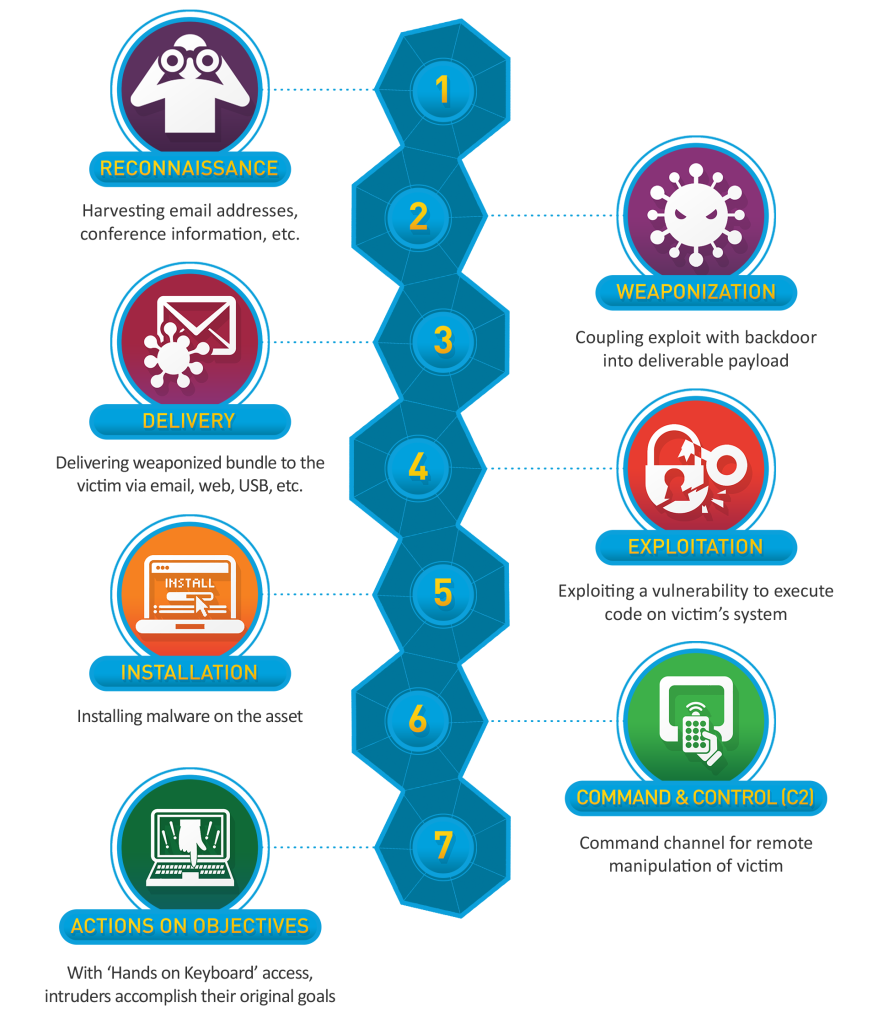 Bu addımların hər biri digərilə əlaqəlidir, bir addım həyata keçməmiş digərinə keçilməz, bu səbəblə zəncir olaraq xarakterizə edilmişdir. Zəncir, ən zəif halqası qədər güclüdür deyimi bu nöqtədə müdafiə edən tərəf üçün deyil, hücum edən tərəf üçün istifadə edilməkdədir. Modelin əsas fikrini “Hücum addımlarının hər hansı birinin uğursuz olması, hücumu uğursuz qılacaqdır” düşüncəsi əmələ gətirməkdədir. Cyber Kill Chain addımları qısaca aşağıda izah edilmişdir: